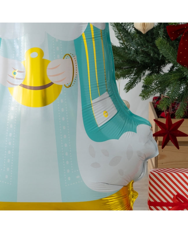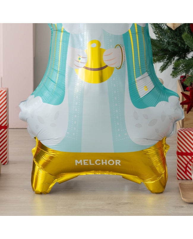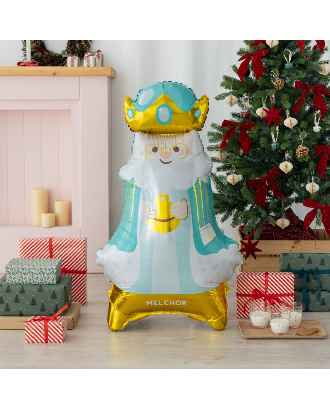 El más sabio y entrañable de los Reyes ya puede estar en tu casa en forma de globo foil con pie del Rey Melchor. Fácil de inflar con aire, sin helio y con válvula de autocierre, se mantiene de pie sobre el suelo, listo para acompañar los regalos.